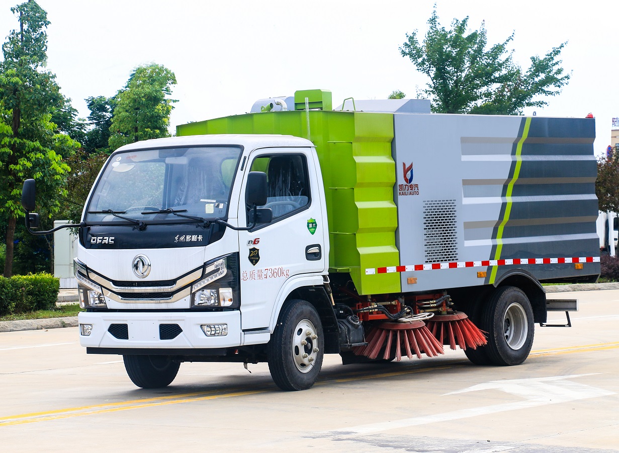 cleaning and sweeping vehicle is an efficient sanitation vehicle that integrates the functions of a road sweeping vehicle and a high-pressure cleaning vehicle. The vehicle adopts Dongfeng Tianjin second-class chassis and is equipped with a secondary engine and its transmission device, garbage bin, clean water tank, cleaning device, dust reduction system, suction nozzle, low-pressure flushing system, high-pressure cleaning system, hydraulic system, pneumatic system, electrical system and other components.