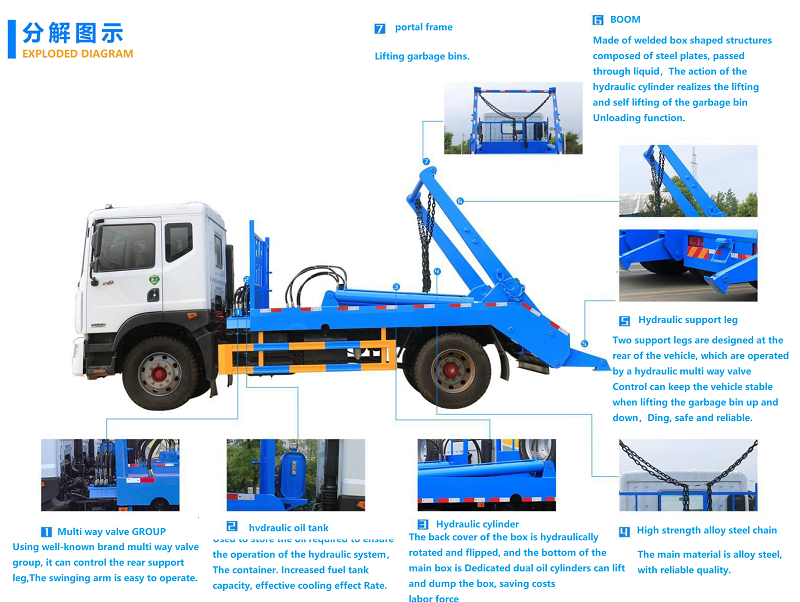 The swing arm garbage truck is suitable for the national general garbage hopper, with self dumping function, hydraulic operation, and the garbage hopper can be self lifted